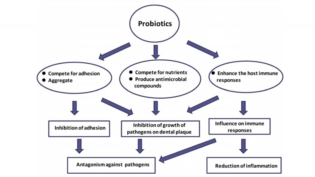 Ainsi, les bactéries des probiotiques entreraient en compétition avec celles de la cavité buccale pour leur adhésion, mais aussi leur alimentation, réduisant d’autant la croissance des pathogènes de la plaque dentaire. Les probiotiques produiraient en outre des composés antimicrobiens.
