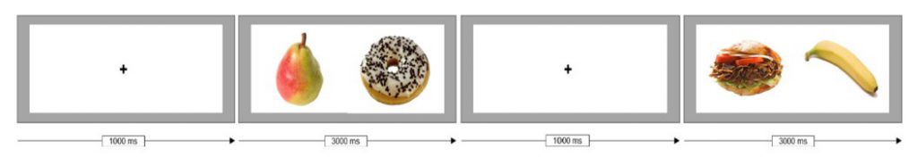 Chaque participant était ainsi exposé à une série de 30 images présentant systématiquement deux aliments, l’un dense (> 100 kcal/100g) et l’autre faible (< 100 kcal/100 g) en calories ; une croix de fixation au centre de l'écran apparaissait pendant 1 seconde entre chaque image (Figure 1).