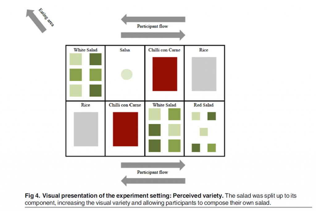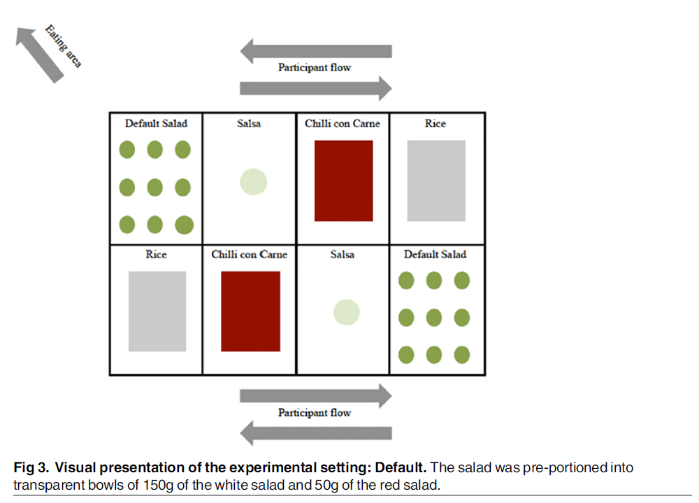 Autre résultat notable : le fait de proposer des salades dans des bols contenant 200 g de salade composée par défaut conduisait à une augmentation des quantités de légumes consommés de 45 g ; sans pour autant diminuer la quantité de chili con carne consommée et donc l’apport énergétique total.