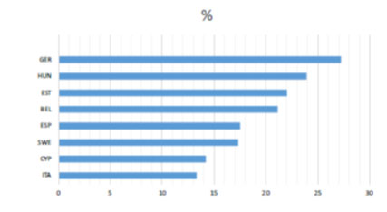 Figure 2 : Contributions moyennes des sucres libres aux apports énergétiques quotidiens totaux selon les pays (Pays par ordre : Allemagne, Hongrie, Estonie, Belgique, Espagne, Suède, Chypre, Italie).