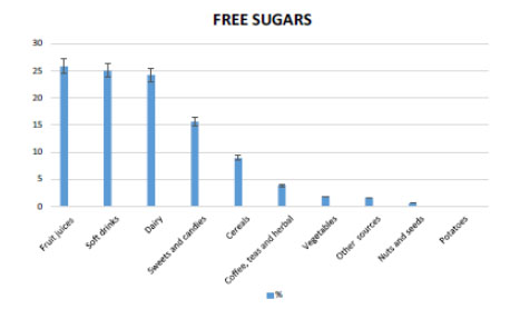 Lorsque l’on observe les apports en sucres libres provenant des différents groupes d’aliments, peu de différences majeures sont observées en fonction de l’âge ; on peut toutefois noter un apport en sucres libres provenant des jus de fruits plus élevé de 10 g chez les garçons de 6 à 9 ans que les garçons plus jeunes.